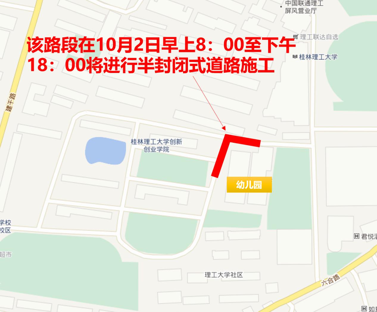 为改善校园环境,方便师生员工、社区居民出行,学校于10月2日早上8:00至下午18:00对南校区22号学生公寓门口至七星菁茵幼儿园的路段进行半封闭式道路施工,道路维修施工期间,请您提前选择绕道而行。此外,施工期间道路两侧不能停放车辆,已经停放的车辆请您在施工前尽快移出。