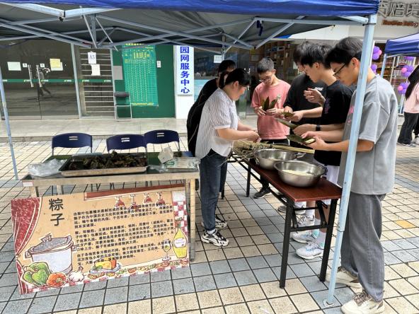 为保证“三月三”美食节活动的顺利开展,饮食中心提前进行相关物资准备,精心布置场地,营造出浓厚的美食文化氛围。活动现场,同学们积极参加各项活动,用双手和味蕾体验最真切的壮乡风情,一起享受制作美食并与他人分享的乐趣。其中跳竹竿舞和跟食堂阿姨学习制作青团、包粽子、五色糯米饭大受欢迎,吸引了许多同学的热情参与。