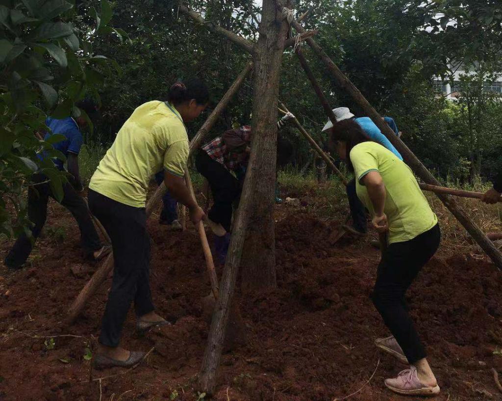 图5 物业中心工作人员给树木填土固定撑杆