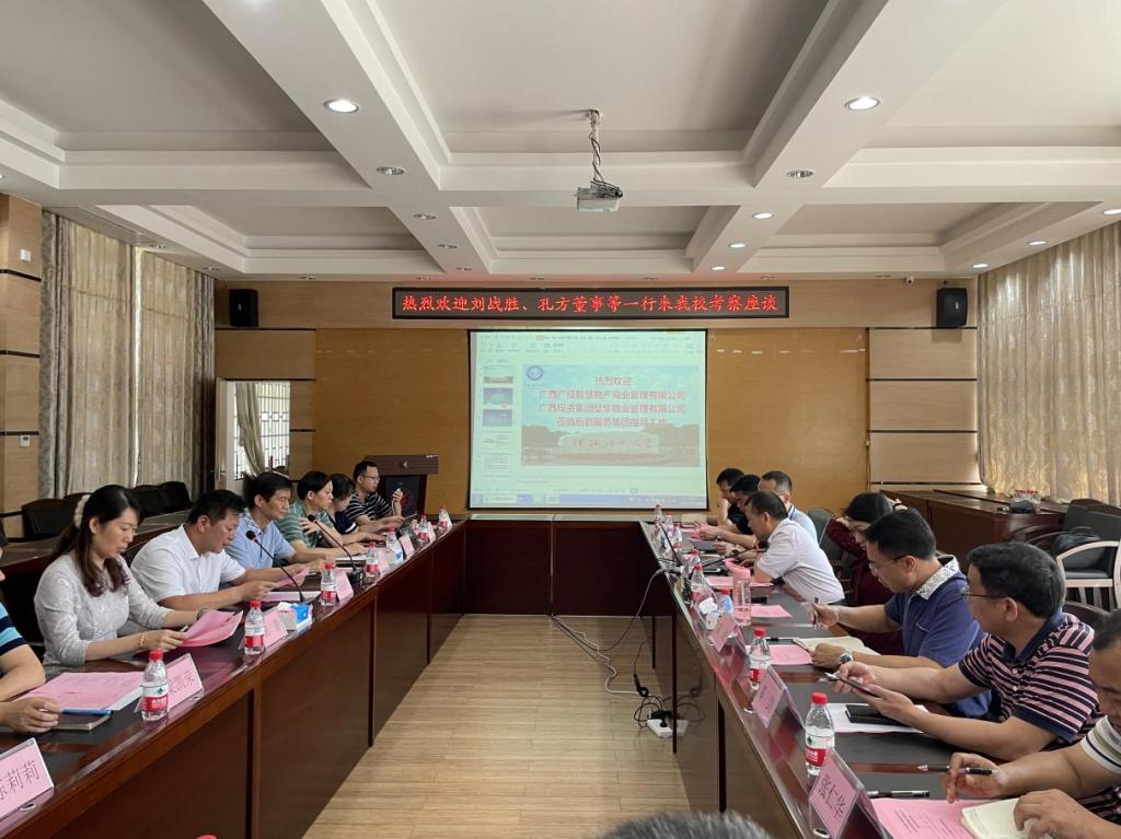 14日上午,双方于屏风校区会议室展开座谈,座谈会上,集团直属党支部书记秦勤忠向来宾介绍了我校后勤运营的基本情况,并一起观看了后勤各中心规范操作视频。刘战胜、孔方董事并分别向与会人员介绍了广西广投、广西投资近期的相关运营情况和发展方向。随后,双方分别围绕用餐服务、物业管理、物资采购、水电维修等方面事宜,进行了深入的探讨交流。