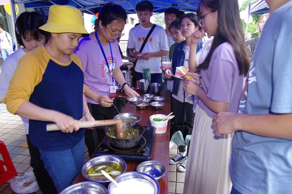 水果游戏专场、美食一条街、饮食文化大揭秘、美食制作体验区,每个区域前都排着长长的队伍,翘首企盼美食节到来的同学们迫不及待地来到现场,身心放松地享受这一场饕餮盛宴。一边是摆满各色美味的美食街,一边还有丰富的游戏以及饮食文化展示,现场的美食制作体验,更是让参加活动的同学回味无穷。