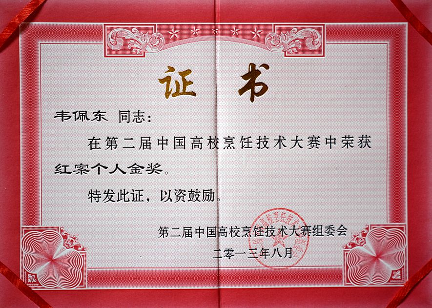 第二届中国高校烹饪技术大赛于今年7月在沈阳东北大学隆重举行。经过各省层层选拔,来自全国30个省、市、自治区137所高校的481名选手代表参加了本次大赛。广西区高校经过预赛选拔了7所高校共21名选手组成了广西区代表队,我校选派的厨师韦佩东、叶国忠、秦勇涛三位同志均参加红案比赛。为赛出我校厨师的烹饪水平,后勤集团在赛前精心组织,对厨师进行预赛选拔,挑选精兵强将参赛,后勤集团领导多次检查厨师准备情况并进行赛前指导,严格按照评分标准进行赛前练兵,最终我校代表队不负众望取得了本次比赛良好成绩,其中韦佩东同志除获得个人金奖外,还取得了红案个人三十佳的优异成绩(广西代表队中唯一的获奖者)。