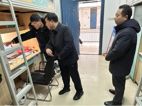 在2号、3号组团留校学生宿舍,唐重振重点检查了学生宿舍的水电安全、消防隐患及卫生情况等,并叮嘱留校学生树牢安全第一的意识,牢牢守住安全底线,养成良好的健康生活习惯。在走访交流过程中,唐重振了解了学生的思想动态、学习情况、生活安排等情况,鼓励同学们合理安排假期,科学规划实验进程,平衡好学习和日常生活,保持身心健康,要与家长、导师、辅导员保持密切联系,希望同学们在学校度过一个平安充实的寒假。