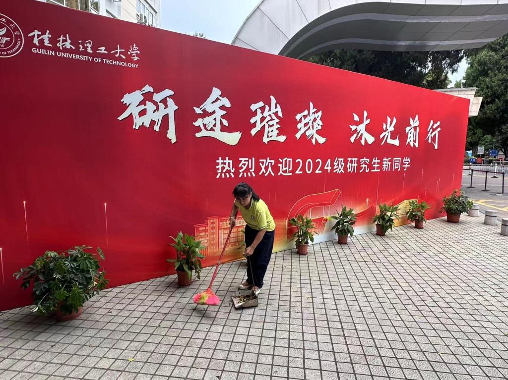 物业管理部提前对校园环境开启全方位整治,对各个楼栋及校园开展卫生保洁。干净整洁的校园道路、修剪整齐的绿化景观、擦拭过的楼宇使得校园环境焕然一新,给新生和家长们留下美好的桂工印象。