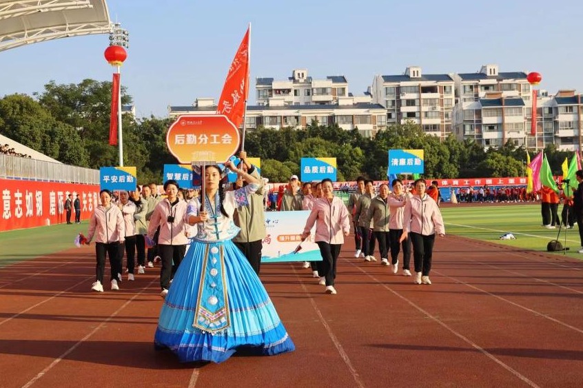 开幕式上,后勤分工会代表队,身着统一的服装,迈着整齐的步伐,带着昂扬的气势通过主席台。教职工们个个精神饱满,朝气蓬勃,高喊铿锵有力的“后勤、后勤,服务为民,齐心奋进,勇挑重担!”口号,充分展现了后勤良好的精神风貌和高涨的运动热情!