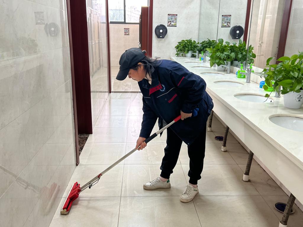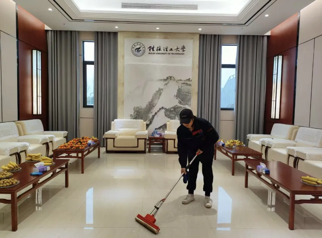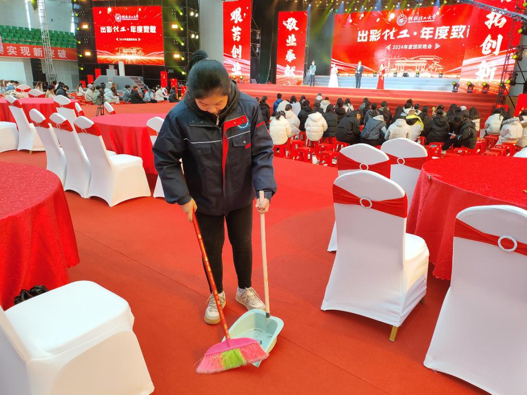 活动前夕,后勤物业管理部对晚会场馆每一处进行细致清扫,消除灰尘,擦拭地面和设备,呈现干净明亮的空间。同时,加大对活动区域的巡查力度,增派保洁人员、加强卫生清扫、消毒和垃圾转运频率,保障学校重大活动的顺利进行。