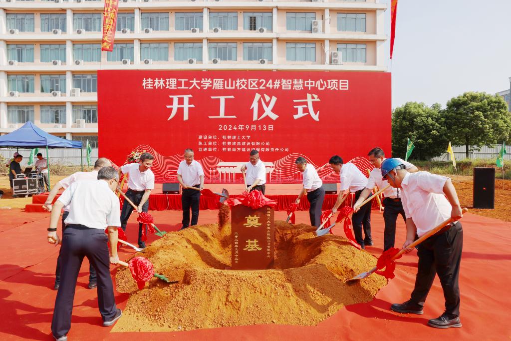9月13日上午,我校雁山校区24#智慧中心项目开工仪式顺利举行。学校党委书记邓军,党委副书记、校长王敦球,党委副书记吴志强,自治区纪委监委驻桂林理工大学纪检监察组组长,学校党委常委、纪委书记韦学敏,党委常委、副校长王磊,党委常委、副校长黎贞崇,党委常委唐壮东、叶昊、邱杰,校长助理张成龙出席仪式。学校相关职能部门负责人,基建处全体教职工,承建单位、监理单位、设计单位代表参加仪式。开工仪式由学校党委常委、副校长王磊主持。