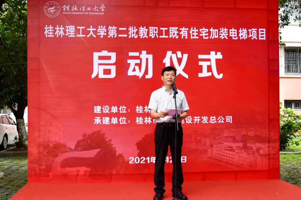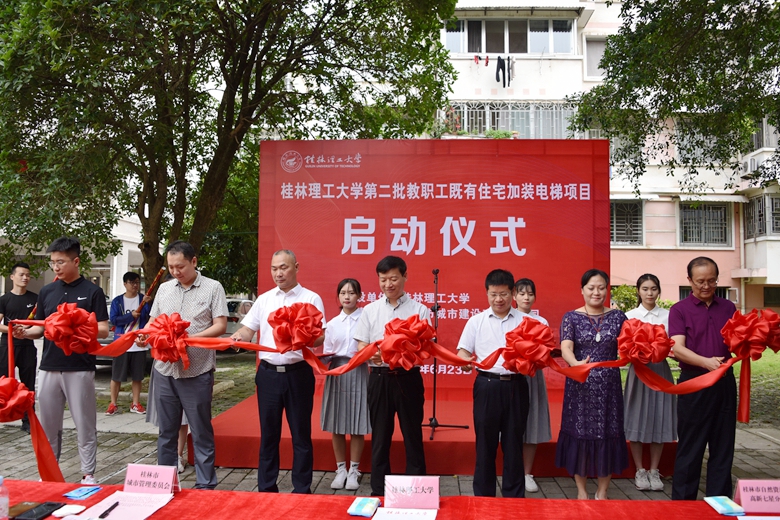 6月23日上午,我校在东城小区教职工家属区举行第二批教职工既有住宅加装电梯项目启动仪式。学校党委副书记、校长解庆林,桂林市城市管理委员会党组成员、副主任谢应明,桂林市城市建设开发总公司总经理温莉,桂林市七星区住房和城乡建设局、桂林市自然资源局高新七星分局、七星区东江街道办相关人员出席仪式。启动仪式由学校党委常委、副校长邓国彬主持,学校党办校办、党委组织部及学校既有住宅加装电梯工作小组全体成员单位主要负责人,小区业主委员会和部分业主代表参加仪式。