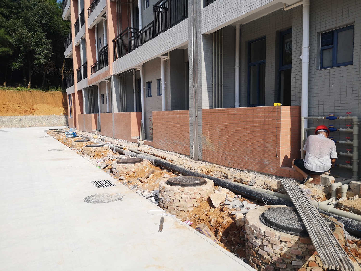 代处强调注意施工安全以及暑期防暑,在保证质量安全的前提下把控施工进度,确保8月5日前附属道路及宿舍出入口等场地能够满足后勤集团进空调和家具的要求。孟永华副处长也对6#学生宿舍北侧雨污水井以及东侧挡土墙后土坡施工方案结合实际情况进行方案探讨以及技术指导。