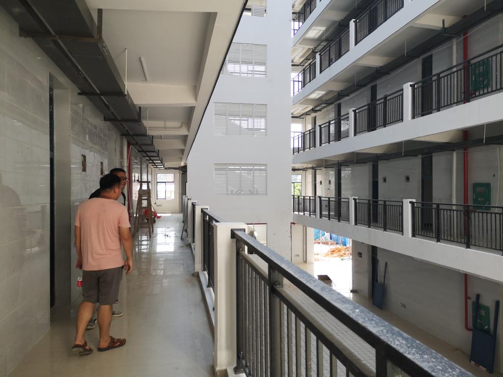 为响应学校九月份新生开学对6#学生宿舍使用的号召,基建后勤处处长代武社于2019年7月29日率领处领导以及工地代表等一行不畏酷暑、坚守岗位,对雁山校区6#学生宿舍及附属设施施工情况进行检查。